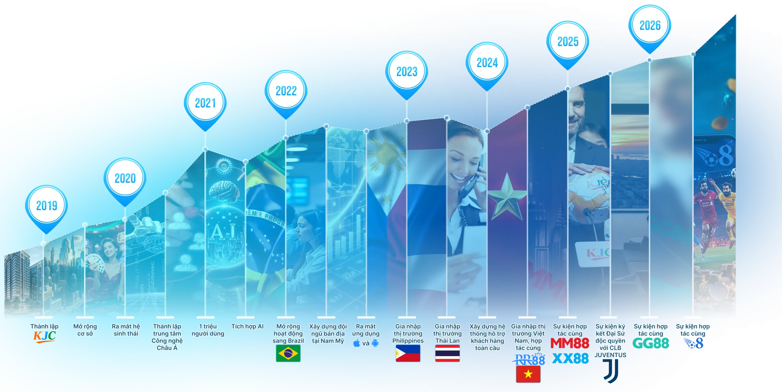 Liên minh quốc tế KJC được thành lập năm 2019 với sứ mệnh kiến tạo hệ sinh thái toàn cầu, bước vào thị trường giải trí trực tuyến liên minh mang đến nhiều tiện ích tích hợp nhiều dịch vụ từ giải trí trực tuyến, tiếp thị liên kết, marketting online của nhiều thương hiệu uy tín khác nhau. Sau giai đoạn tăng trưởng mạnh mẽ tại khu vực Đông Nam Á, liên minh quốc tế KJC đã giới thiệu nền tảng giải trí trực tuyến và ứng dụng trí tuệ nhân tạo (AI), thu hút hàng triệu người dùng trên toàn cầu. Liên minh KJC tiếp tục mở rộng sang thị trường Nam Mỹ 2022, đồng thời ra mắt ứng dụng di động và củng cố sự hiện diện tại các quốc gia chiến lược như Philippines, Thái Lan và Việt Nam. Bước sang năm 2025, sự hợp tác chiến lược với XX88 và MM88 đánh dấu cột mốc phát triển quan trọng, hành trình hoạt động của liên minh đã và đang mở rộng tầm ảnh hưởng toàn cầu và khẳng định vị thế tiên phong của liên minh trong ngành giải trí quốc tế.